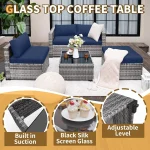 The tempered glass coffee table offers a sleek, modern touch and is fully removable for easy cleaning. Cushion covers feature durable zippers for quick removal, making maintenance simple and stress-free. Adjustable levelers ensure stability on uneven surfaces, so your setup stays secure wherever you place it.
