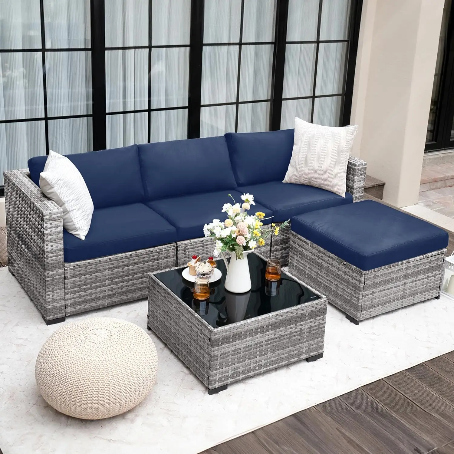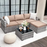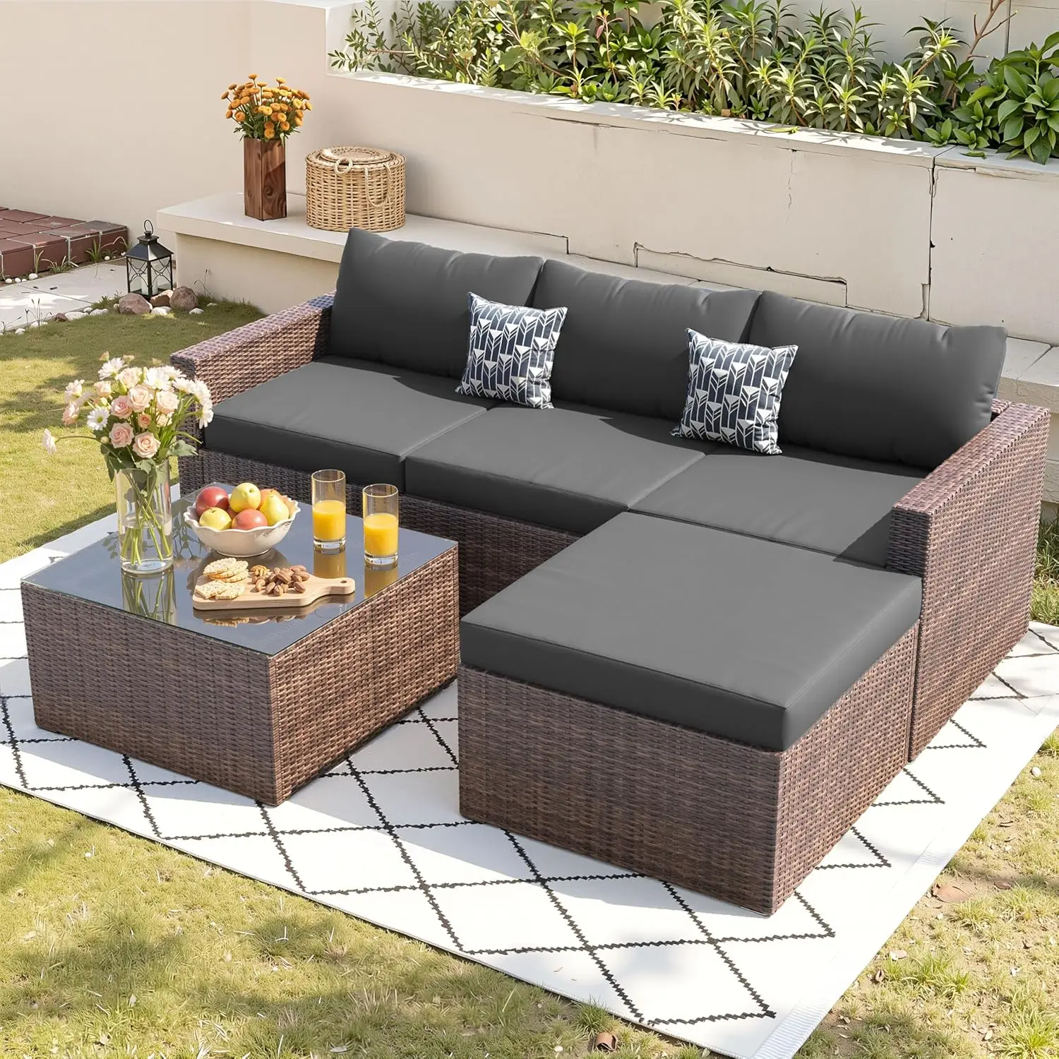 5-Piece Modular Outdoor Patio Furniture Set with Waterproof Cushions – PE Wicker Sectional Sofa, Tempered Glass Table, All-Weather Backyard Conversation Set